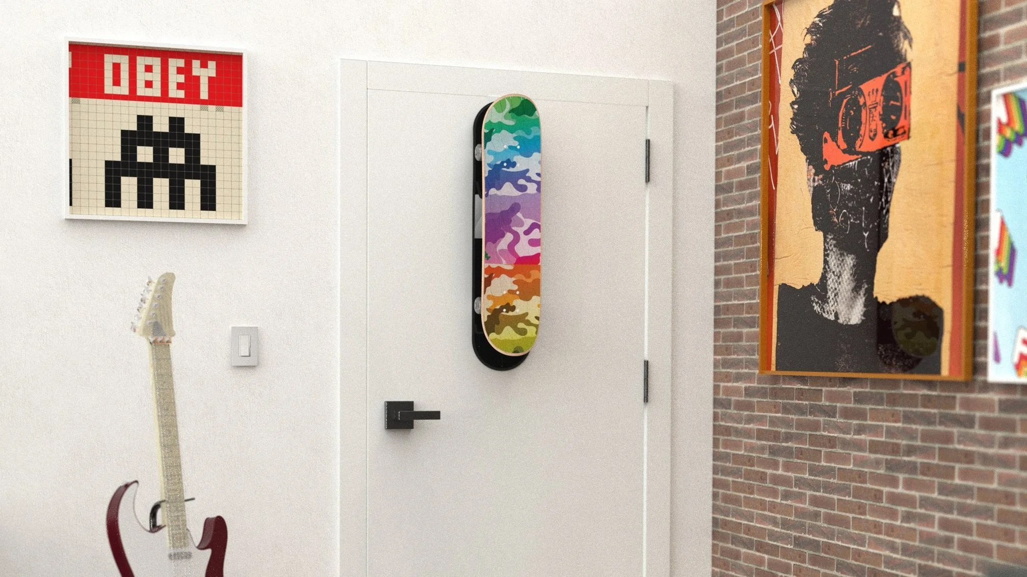 A unique skateboard accessory that doubles as an art mount, elevating the aesthetics of your room while keeping your gear safe and secure. This skateboard holder is essential to your skateboarding accessories, tidying up spaces and showcasing your passion.